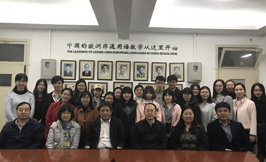 10月24日,校长彭龙到欧洲语言文化学院进行专题座谈,就非通用语种教材、工具书建设规划、师资队伍建设、国别与区域研究等问题进行工作部署,并参加“欧洲非通用语师资储备班”启动仪式。副校长贾文键出席座谈和启动仪式。