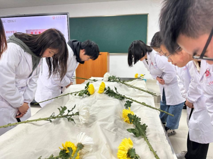 紧接着,师生们手捧菊花,缓步进入解剖学实验大楼,向“大体老师”鞠躬默哀,并献上鲜花,以表达对他们无私奉献精神的崇高敬意。
