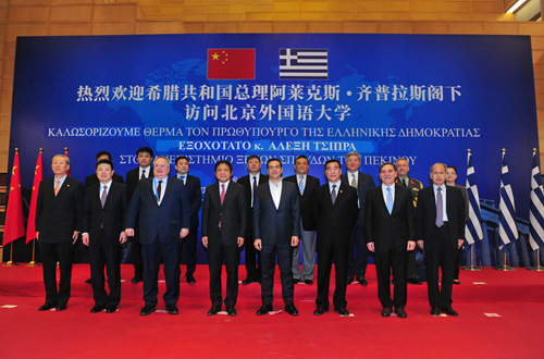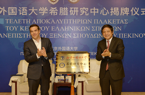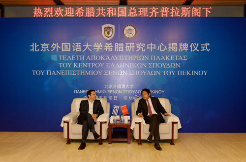5月12日下午,来华出席“一带一路”国际合作高峰论坛的希腊共和国总理阿莱克斯•齐普拉斯(Alexios Tsipras)访问我校,为北外希腊研究中心揭牌。