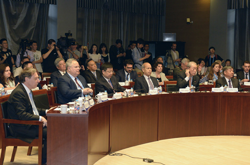 希腊外交部长尼克斯•科齐阿斯(Nikolaos Kotzias)、希腊驻华大使列奥尼达斯•罗卡纳斯(Leonidas Rokanas)等希腊重要官员随同来访。中国驻希腊大使邹肖力、前驻希腊大使甄建国、前驻塞浦路斯大使赵亚力、国家留学基金管理委员会副秘书长张宁、中国交通企业管理协会会长李科浚、中远海运副总经理孙家康、首都博物馆馆长郭小凌、北京华江文化发展有限公司董事长陈绍枢、中国交通企业管理协会副秘书长彭前磊、中国社会科学院研究院王柯平、首都师范大学教授晏绍祥、我校校长彭龙、副校长闫国华等出席仪式。仪式由闫国华主持。