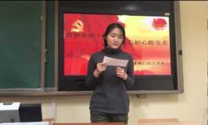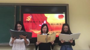 诗朗诵结束后,黄峥迪、李秋玥和付心怡同学就“十九大”主题,热议本次党代会的报告,结合实际分享学习心得体会。此外,他们还谈了了自己对党和国家的期盼与向往,畅谈中国梦。另外,裴梓原、王馨悦、许楚琪、谢雨杉、常江涵、张小宇同学还结合自己初入大学以来的切身感受畅谈了自己的大学梦,分享了自己在大学阶段的目标。