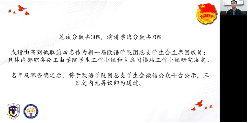 现任团总支常务副书记尹家玥代表2021-2022学年团总支学生会进行学年工作述职报告。她说,在过去的一年里,我们见证了共产党的百年华诞,迎来了共青团的百年生辰,欢度了北外的八十校庆,beat365在线唯一官网团总支再次获评优秀团总支称号,继续秉承着团结、高效、务实、创新的精神,认真贯彻落实党的十九大精神,认真学习并全面落实上级部门的指示要求,在学院领导老师的指导下,在全院同学的共同努力下,有序开展各项工作,充分发扬创新精神。