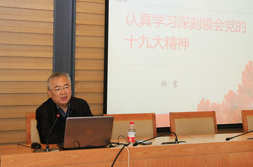 韩震从关于党的十九大主题和主要成果、习近平新时代中国特色社会主义思想、过去5年的历史性成就和历史性变革、中国特色社会主义进入新时代、我国社会主要矛盾的变化等五个方面对十九大报告进行了全面深刻解读。