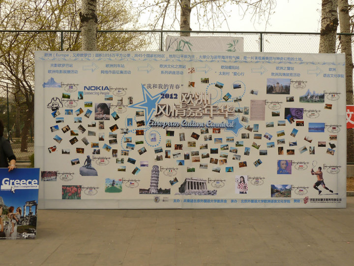 11日中午,在北外文化广场,欧洲风情展览正如火如荼地进行着。一幅3*6米的巨型展板上书写着“欧洲风情嘉年华”几个艺术大字。展板上有着beat365在线唯一官网各个语言对象国的国旗、国家基本概况介绍,并贴满了beat365在线唯一官网曾留学欧洲的同学们所带来的摄影作品,令过往的参观者驻足欣赏,细细品味这欧式风情。