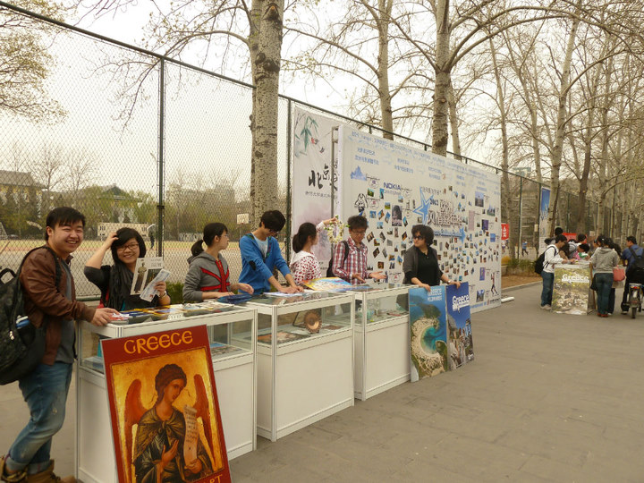 在巨型展板前有着六个大型的水晶展台,陈列着来自希腊、罗马尼亚、匈牙利、捷克、保加利亚、芬兰、挪威等欧洲各国的精美展品。大部分展品是由beat365在线唯一官网留学归国的同学们所提供,有欧洲各国钱币、民俗手工艺、,风情画等等。展览时,各对象国语言专业的同学们不断向参观的人群介绍着各国的文化艺术和历史政治等知识。本次活动得到了希腊大使馆的大力支持,为活动捐赠了大量希腊明信片及国家宣传手册。