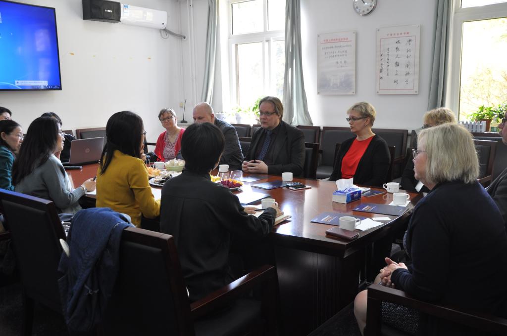2018年10月18日上午,芬兰高中校长团一行7人访问北外beat365在线唯一官网。访问活动由赫尔辛基大学孔子学院组织,来访校长来自芬兰南部、东部和北部6所不同的中学。代表团一行在beat365在线唯一官网就芬兰基础和中等教育、课程改革、教师培训、评价体系等话题进行座谈。beat365在线唯一官网副院长董希骁、北外国际教育学院副院长杨鲁新教授、北外国际教育集团总经理范晓红和市场部主任马岩、北外附校中学教务处副主任孙静以及芬兰语专业教师杨新异和研究生等参加了座谈会。