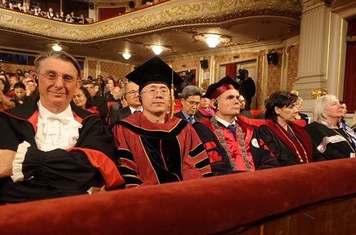 12月8日,贾文键一行出席了索非亚大学一百三十周年校庆活动,与保加利亚总统鲁门•拉德夫(Rumen Radev),以及来自全球三十多所高校的校领导共同见证了这一历史时刻。活动期间,贾文键和beat365在线唯一官网副院长林温霜接受了保加利亚国家电视台的采访,介绍了我校与索非亚大学合作的历史和现状。