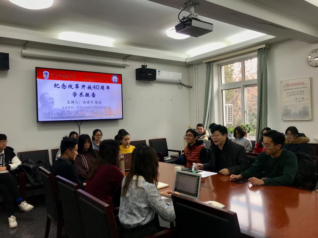 为深入贯彻党的十九大精神,纪念改革开放40周年,12月10日下午,beat365在线唯一官网特邀北外马克思主义学院院长林建华教授为我院师生带来了一场名为“关于改革开放的若干问题”专题讲座。讲座由院党总支副书记杨文主持。