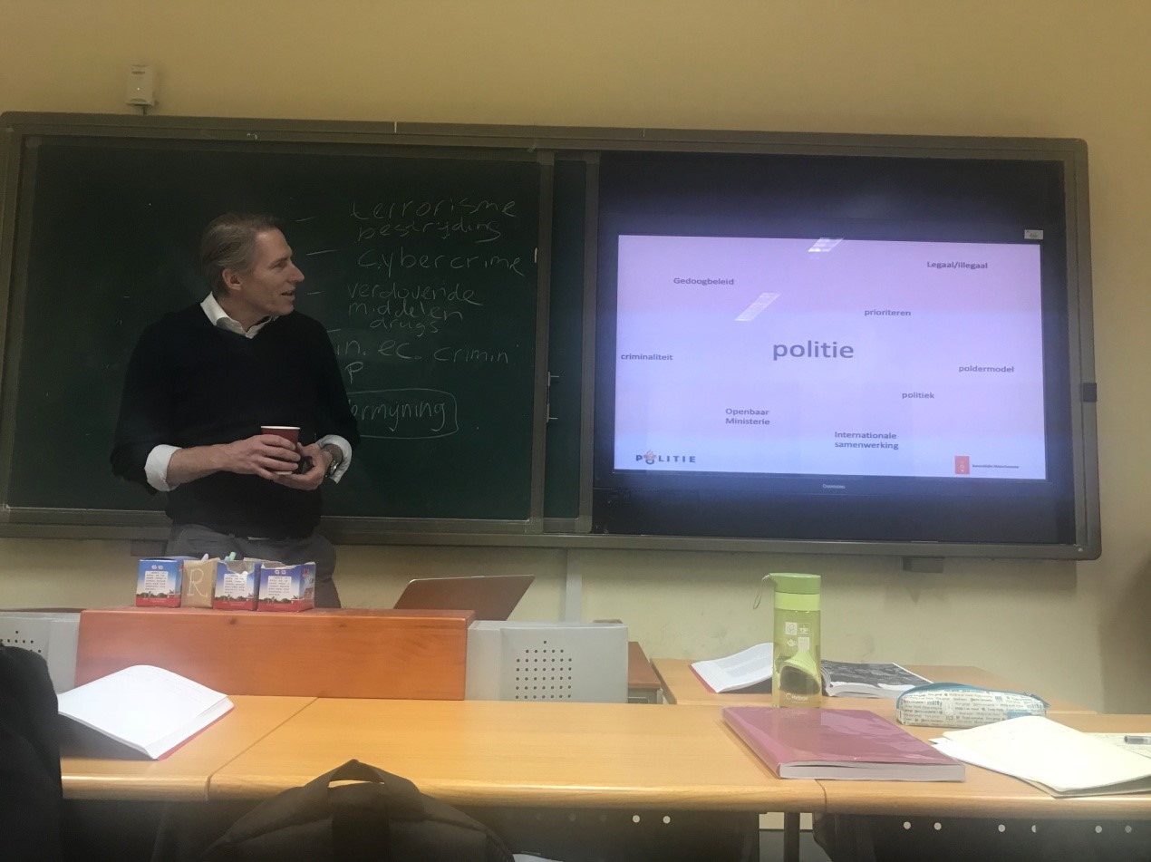 讲座以一部小短片开始,从荷兰警察体系的基本情况为切入点,介绍了荷兰警察自16世纪80年代以来的历史。Knaap先生在之后的时间里详细介绍了荷兰警察体系现行的分级制度以及主要职责,从讲解了荷兰警察体系“三方协商”和“政策宽容”的工作原则。最后,Knaap先生对荷兰警察所主要负责的几项安全问题——恐怖袭击、黑客以及网络犯罪问题、药物毒品问题、经济财产类犯罪问题等——进行了实例说明。