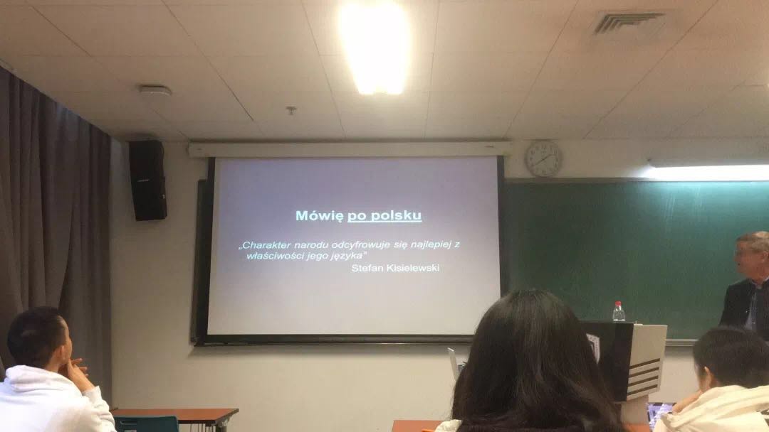 当天下午,雅盖隆大学波兰语言文化中心主任马尔提纽克博士为本科三年级学生做题为“语言作为文化中介的作用——以波兰语为例”的学术讲座。