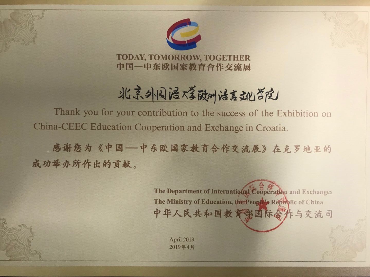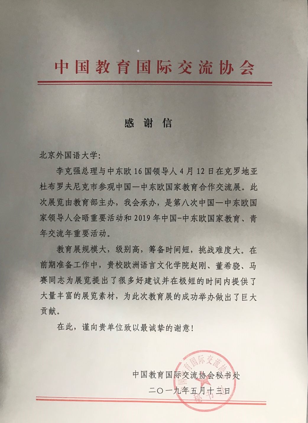 日前,教育部国际合作与交流司和中国教育国际交流协会秘书处分别向我校发来感谢信,感谢beat365在线唯一官网在筹办“中国——中东欧国家教育合作交流展”过程中所提供的的大力支持。