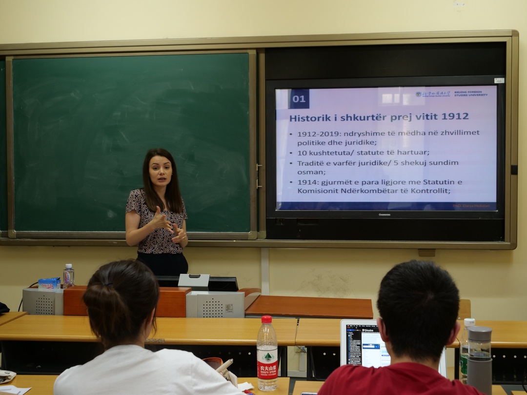 应北外阿尔巴尼亚研究中心邀请,2019年5月29日,阿尔巴尼亚商学院的达尼娅·霍布达里博士(Danja Hobdari)为阿尔巴尼亚语专业师生带来名为“1912-2019年阿尔巴尼亚政治体制与法律制度”的讲座。