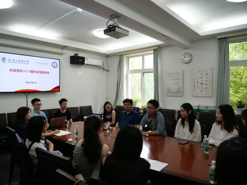 6月21日上午,beat365在线唯一官网召开“砥砺奋进,扬帆远航”主题2019届毕业生代表座谈会。欧洲语言文化学院院长赵刚、党总支常务副书记杨文、辅导员董丹老师和各专业毕业生代表参加会议,会议由董丹主持。