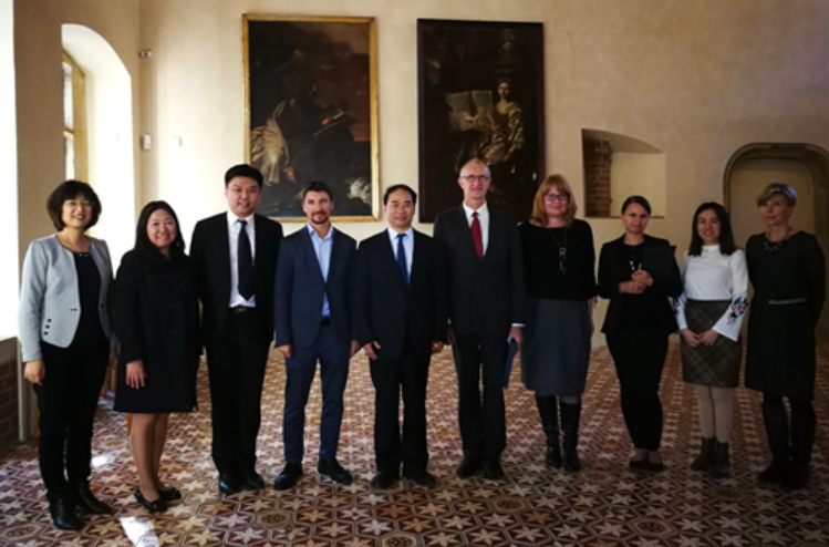 10月16日,王定华一行访问波兰西里西亚大学,与副校长托马斯•皮耶特什科夫斯基进行了会谈,共同回顾了双方的合作历程及取得的成果,并就跨学科交流合作、学生实习、学术交流等进行了深入交流。