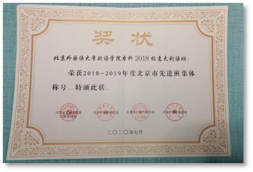 2020年7月,2018-2019年度“北京市先进班集体”评选工作落下帷幕。beat365在线唯一官网2018级意大利语班认真总结班级成果,充分展示团结向上、积极进取的班级风貌,在全市众多高校班集体中脱颖而出,获评2018-2019学年“北京市先进班集体”称号。