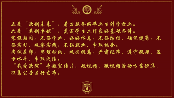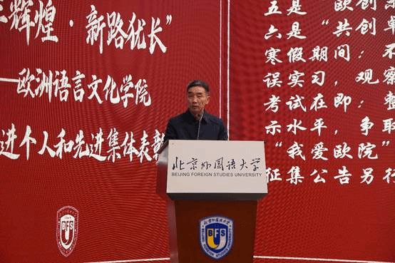 “欧洲语言文化学院全体学生团结一致、积极进取、拼搏奉献、追求卓越,在思想政治教育、学生集体荣誉、个人发展进步上取得了卓越成效,赢得了骄人成绩”,书记在对过去一年所做出的成绩给予高度肯定的同时也表达了对大家的殷切期望,“我们要向获得表彰的个人和集体学习,珍视集体荣誉,发挥示范作用,精进敏学、恪尽职守。学会于困苦中坚持不懈,以恒心勇气收获进步;学会以己之长和卓越不凡的精神追求出类拔萃、带动共同进步;学会致力在每项活动中增光添彩、与众不同;学会在思想深度和理论高度耕耘不辍、用自己的语言领会新时代新思想。”