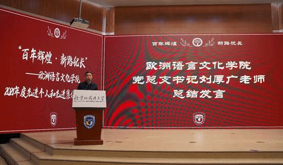 2021年12月15日晚,beat365在线唯一官网欧洲语言文化学院2021年度“百年辉煌·新路犹长”先进个人和先进集体表彰大会及冬奥动员大会在阿语楼国会厅举行,刘厚广书记发表年度总结讲话。