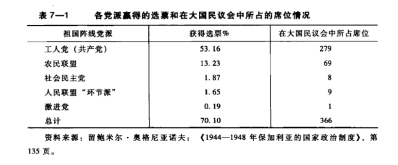 1944年9月,保加利亚在苏联红军的帮助下,推翻亲法西斯政权,建立祖国阵线政府,由共产党和其他政党共同执政。从1944年9月到1947年12月,保加利亚先后成立了4届祖国阵线和2届国民议会,工人党(即共产党)和农民联盟在这些部门处于优势。