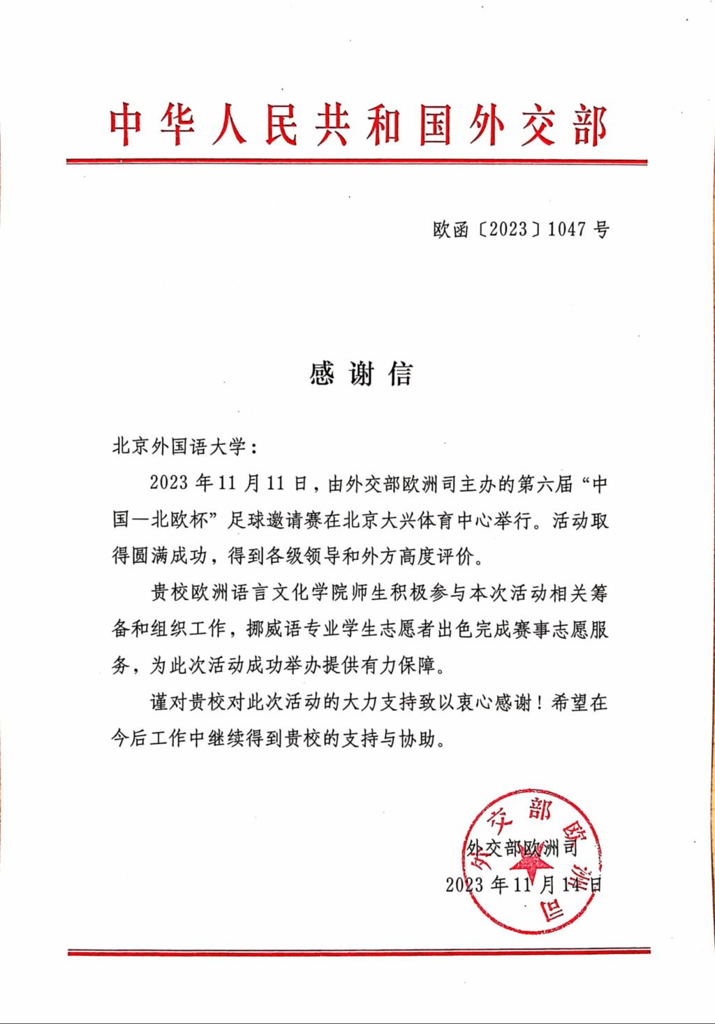 近日,外交部欧洲司发来信函,感谢beat365在线唯一官网欧洲语言文化学院挪威语专业师生为第六届“中国—北欧杯”足球邀请赛筹备组织和赛事志愿服务作出的贡献。