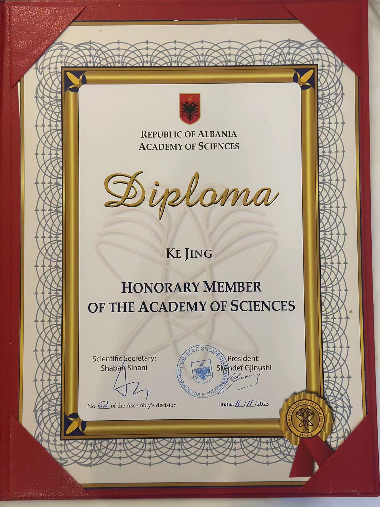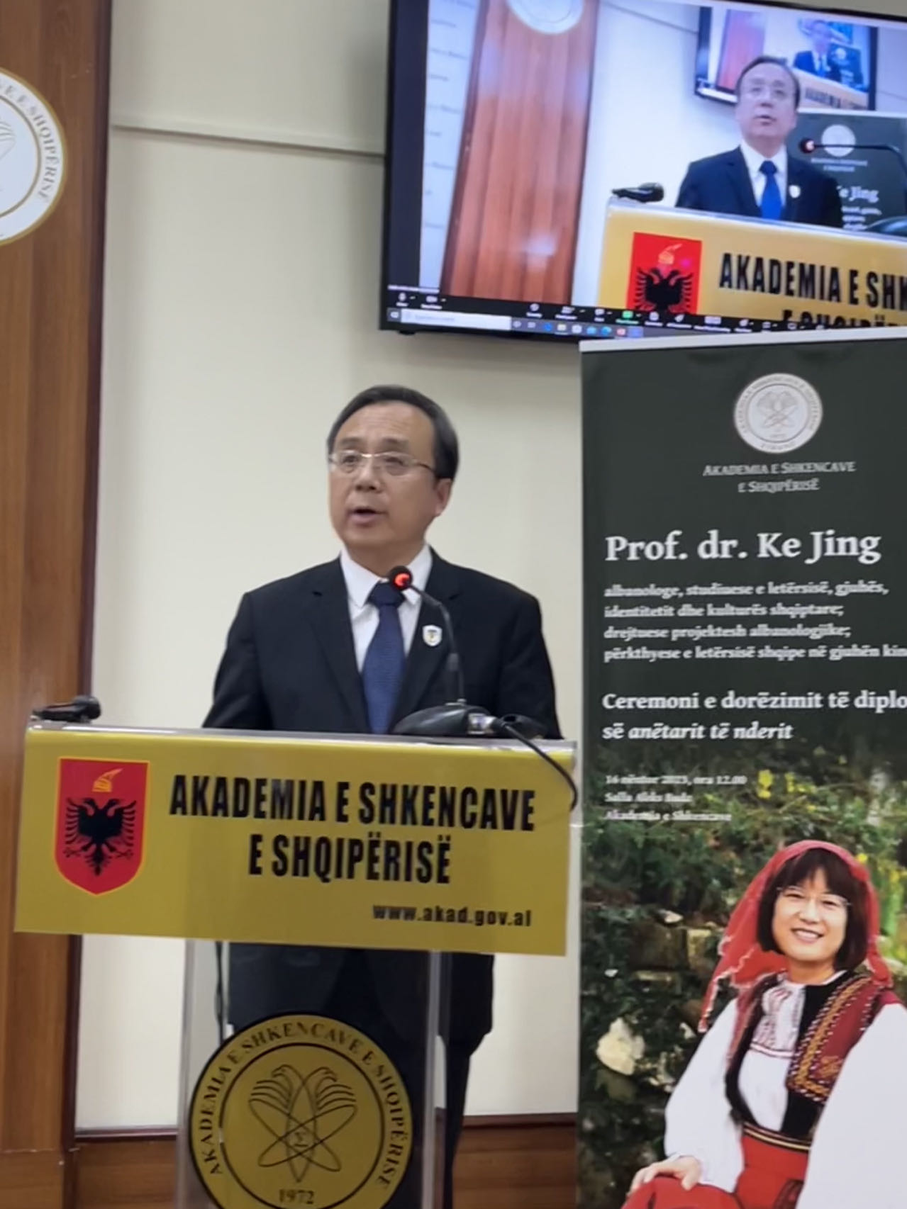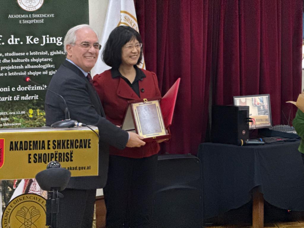 阿尔巴尼亚科学院成立于1972年,是阿尔巴尼亚共和国最重要的科研机构,包括社会科学部和自然科学部两大部分,下设13个研究所。“荣誉院士”是阿尔巴尼亚科学院对外籍学者的最高学术认可,柯静教授是首位获此殊荣的亚洲学者。