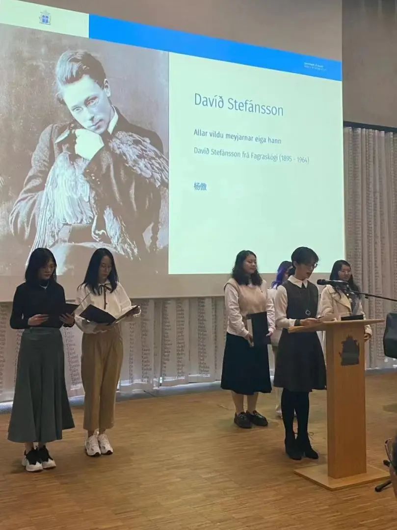 我们也经常在课外接触冰岛的语言和文化。在使馆举办的文化活动中,我与同学们一起策划落地了冰岛音乐会、读诗会,制作了冰岛语MV、萨迦短剧等。除了专业学习,作为校团委艺创技术组副组长和院团学联文艺部干事,我参与了多场大型晚会的组织策划;作为志愿者,我在各级外国政要到访接待会、冰岛独立日接待会、“中国—北欧杯”足球邀请赛、冬奥会国际传播、费那奇国际动画周等大型活动中贡献力量。这四年多元丰富的经历使我有幸获得了东南大学和中国传媒大学艺术学理论专业的推免资格,也激发了我对未知的好奇和热情。期待新一届的学弟学妹们在北外学习语言,开拓视野,探索世界。