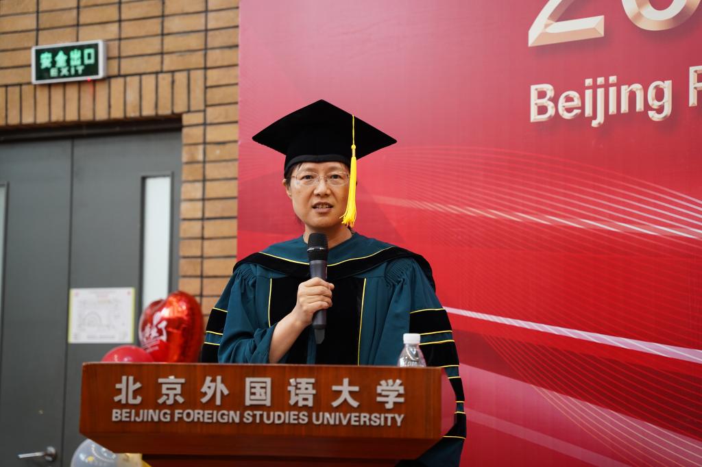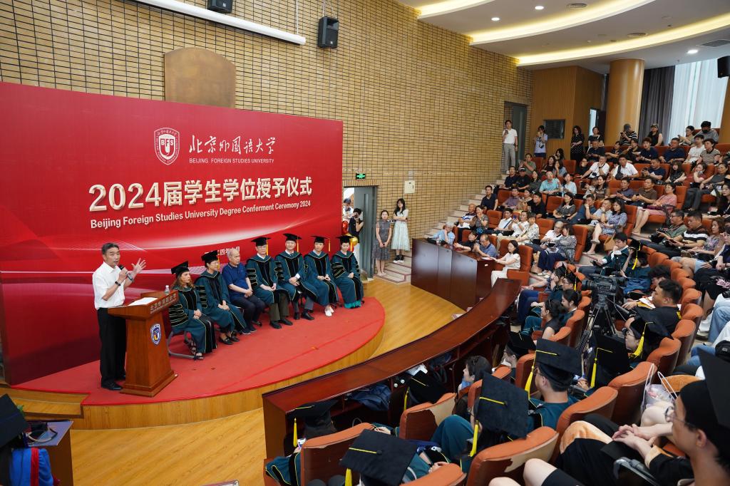 甄建国大使应邀出席并见证学位授予仪式,丁超、柯静、林温霜、董希骁、李婧敬、意大利语专家Monica在主礼席就坐,全院各语种毕业生导师和外籍专家参加活动,刘厚广主持仪式。