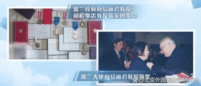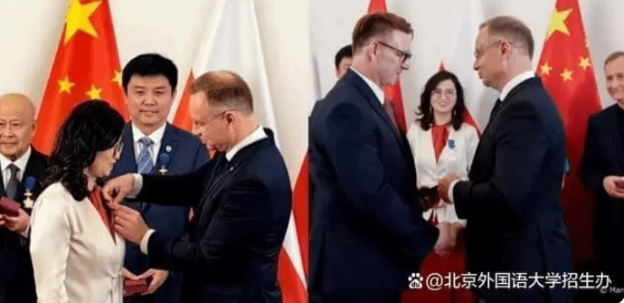 左:波兰总统安杰伊·杜达向北外欧洲语言文化学院波兰语教研室主任李怡楠副教授颁发波兰共和国功勋奖章骑士十字勋章
