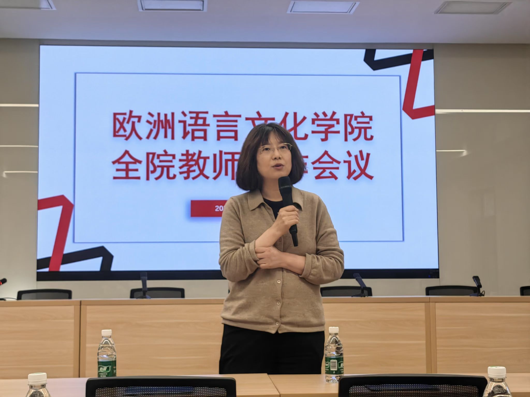 欧洲语言文化学院教师大会于1月10日下午在晨读厅召开。会议听取了刘厚广、柯静做的工作总结,听取了李怡楠、覃方杏、文铮做的专题发言。会议动员全体教师坚持立德树人,赓续红色基因,涵养教育家精神,建设优良师德师风,以高质量党建促进高质量发展,一往无前推动改革,在教育强国新征程上更加奋发有为,做出不愧时代的新贡献。