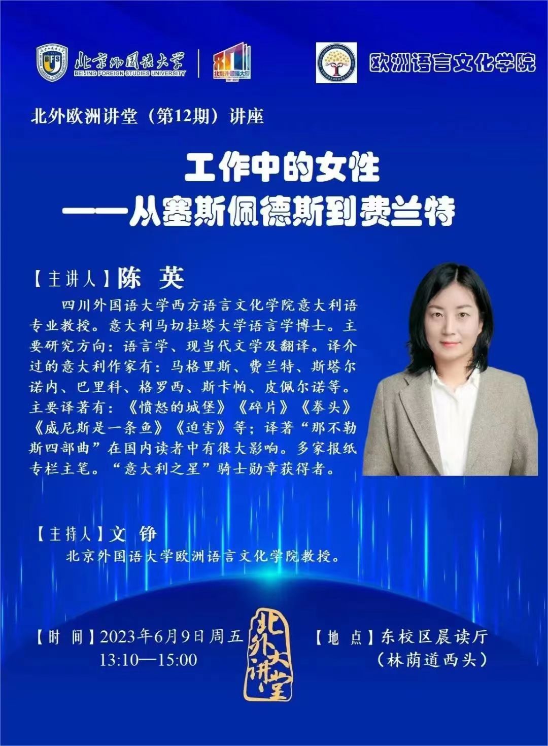 周五的讲座中,陈英将结合自己的翻译经历,与大家一起探讨“工作中的女性”这一话题。