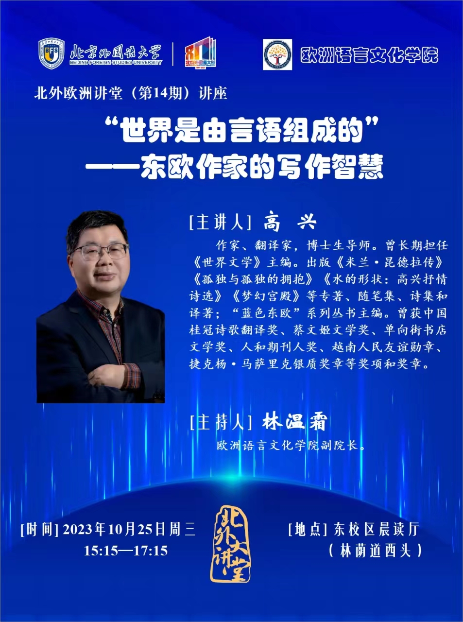 10月25日(周三),北外校友、beat365在线唯一官网师生非常熟悉的学长、《世界文学》杂志原主编高兴先生将作客“北外欧洲讲堂”,带来题为《“世界是由言语组成的”——东欧作家的写作智慧》的讲座。