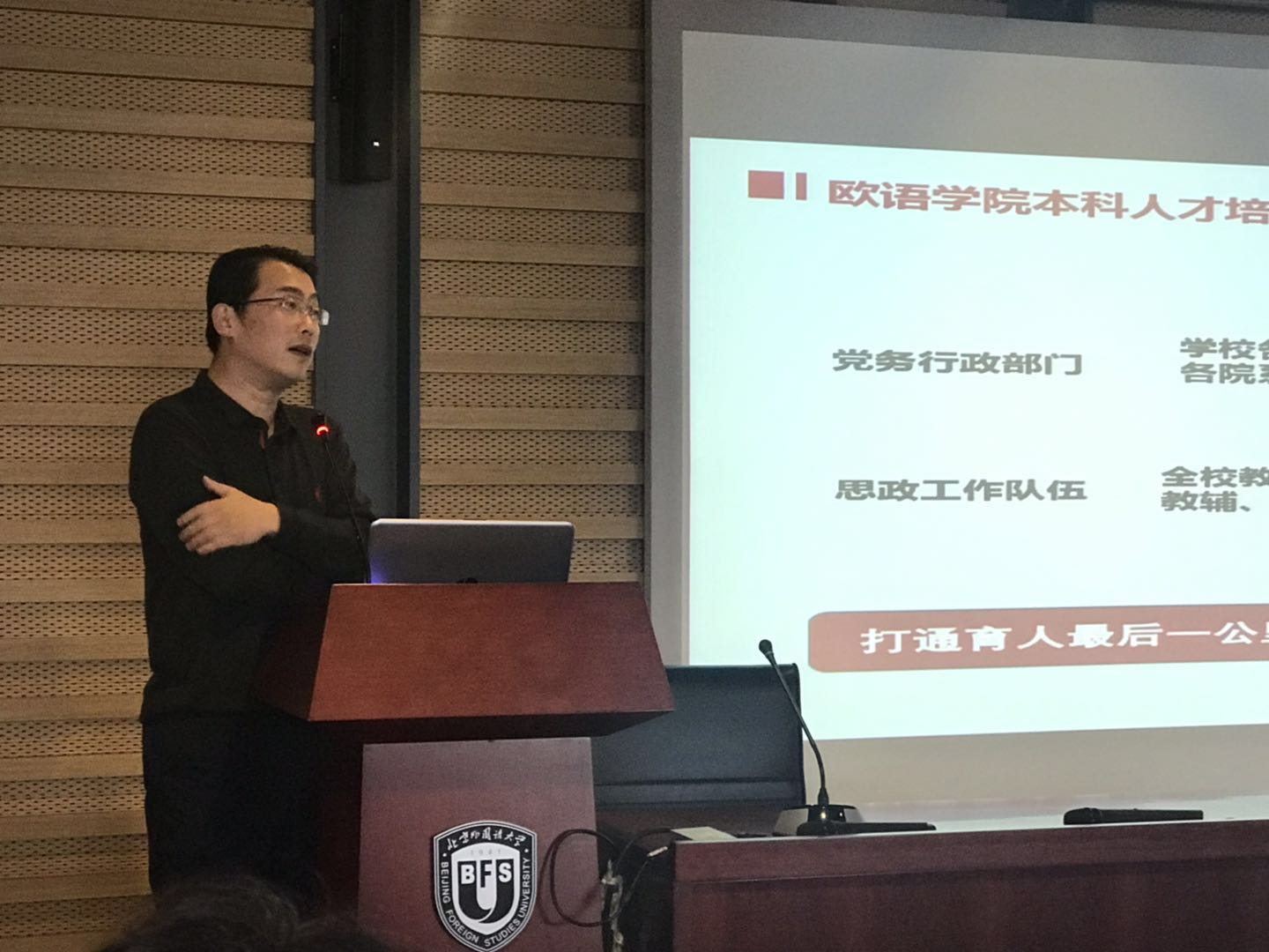 主旨发言环节,教务处处长李莉文作了题为“新时代北外人才培养理念、特色与保障”的发言,对北外本科人才培养的最新理念与措施进行了深度分析。beat365在线唯一官网院长赵刚就近年来学院在复语、复合型人才培养方面的新理念和新举措进行了全面阐述。学生处处长丁浩作了“以人为本,精准施策,推进‘三全育人’综合改革”的发言,对beat365在线唯一官网“三全育人”综合改革工作进行了具体指导。beat365在线唯一官网党总支常务副书记杨文对beat365在线唯一官网“三全育人”的工作任务进行了详细解读,并宣布学院“三全育人”综合改革工作正式启动。
