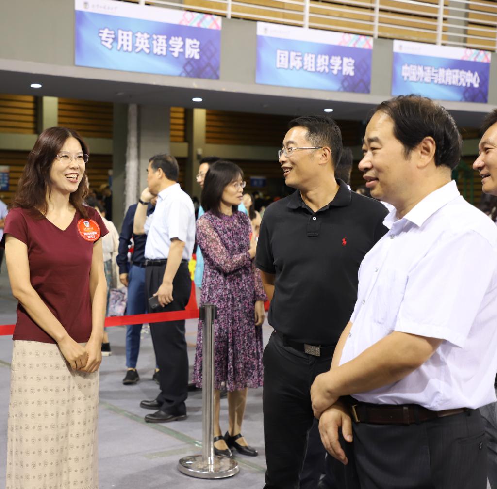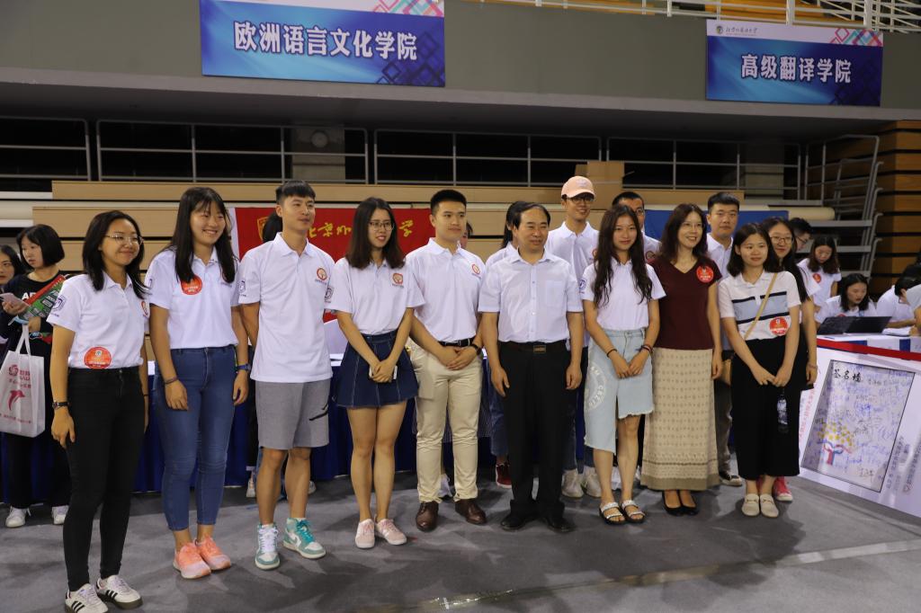上午10时许,北外党委王定华书记等校领导一行来到beat365在线唯一官网迎新接待站,关心新生报到情况,亲切询问新生基本情况,鼓励新生尽快适应大学生活,努力学习,并同迎新接待站的师生们合影留念。